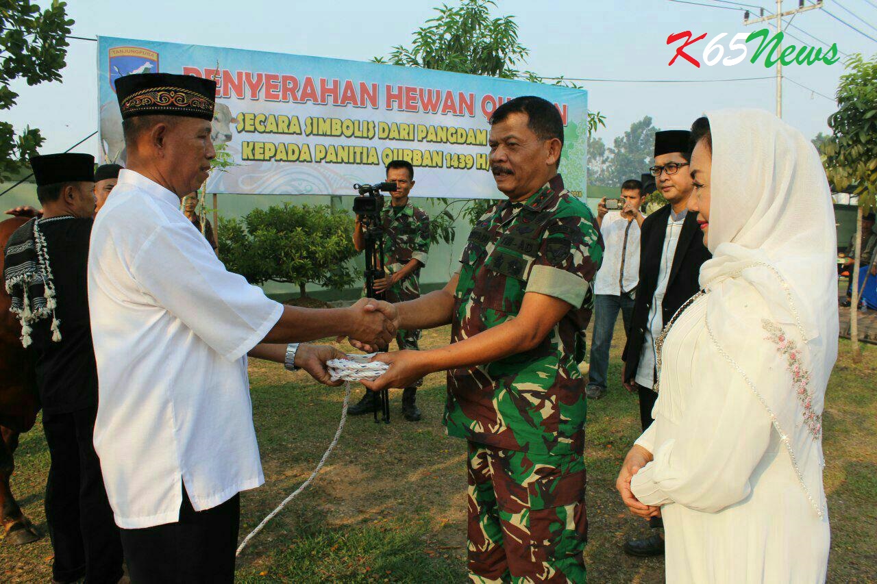 Usai pelaksanaan Shalat Idul Adha 1439 Hijriah, Pangdam XII/Tanjungpura, Mayjen TNI Achmad Supriyadi menyerahkan hewan qurban secara simbolis satu ekor sapi kepada panitia untuk disembelih dan dibagikan kepada yang berhak menerimanya. Secara keseluruhan ada 2 ekor sapi dan 14 ekor kambing yang disembelih di Kodam XII/Tanjungpura.***(SP/K65News).