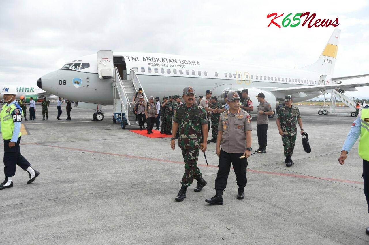 Dengan menggunakan Pesawat Boeing 737-400 A-7308 TNI AU dari Lanud Halim Perdanakusuma Jakarta Timur, kedatangan Panglima TNI dan Kapolri disambut oleh Pangdam IX/Udayana Mayjen TNI Benny Susianto, S.I.P., Panglima Komando Tugas Gabungan Terpadu (Pangkogasgabpad) Mayjen TNI Madsuni, S.E., Kapolda NTB Irjen Pol Drs. Achmad Juri, S.H., M.Hum,Danlantamal VII Kupang Brigjen TNI (Mar) Kasirun Situmorang, S.H., Danrem 162/Wira Bhakti Kolonel Czi Ahmad Rizal Ramdhani, S.Sos., S.H., M.Han. serta Danlanud Rembiga Kolonel Nav Budi Handoyo, M.Tr.(Han).