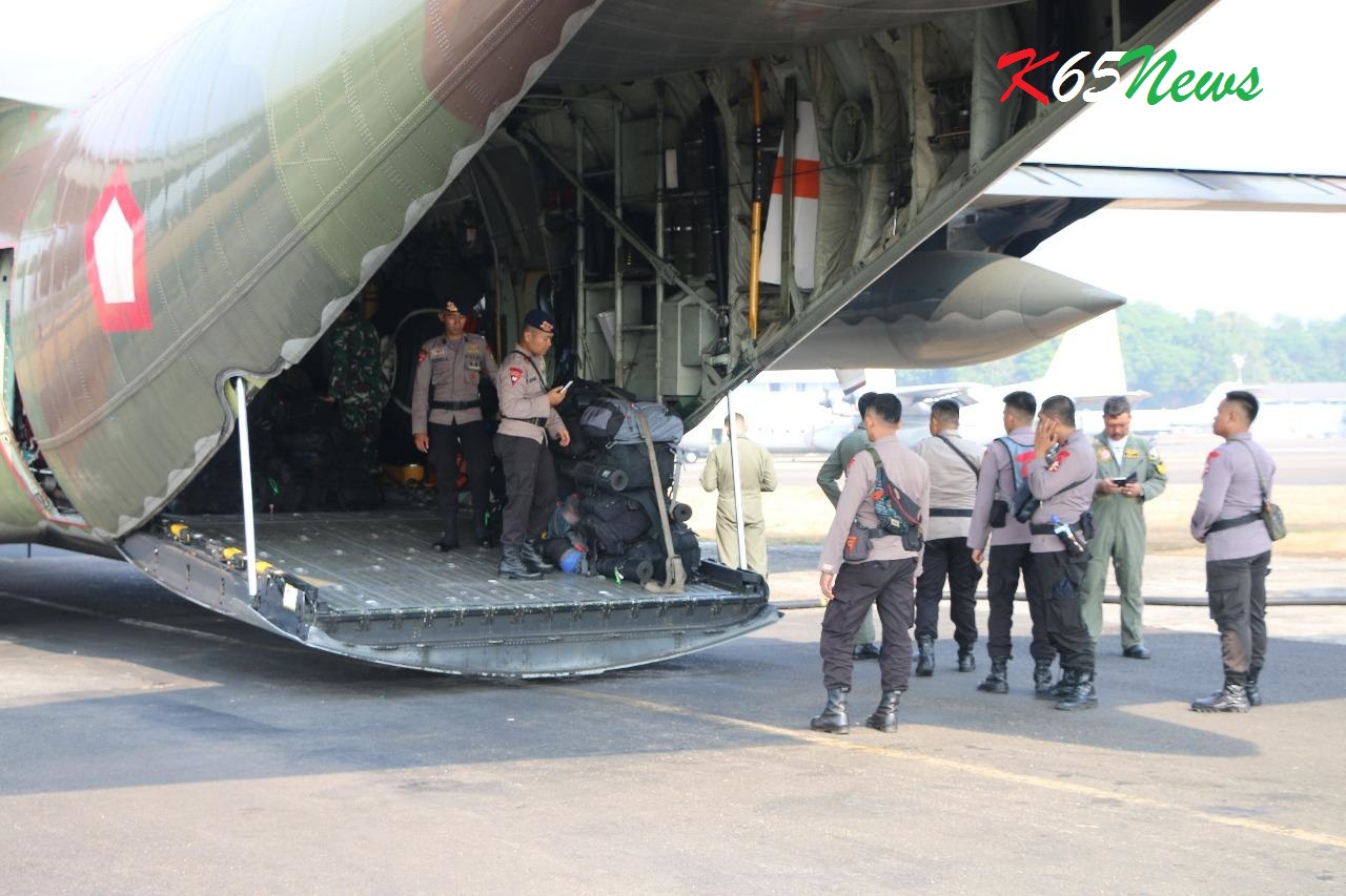 Personel Brimob yang diberangkatkan ke Palu bertugas dalam rangka pengawalan ketat dalam proses pengiriman logistik pasca terjadinya bencana alam di Palu, hal itu untuk mencegah terjadinya hal-hal yang tidak diinginkan seperti penjarahan.***(SP/K65News).