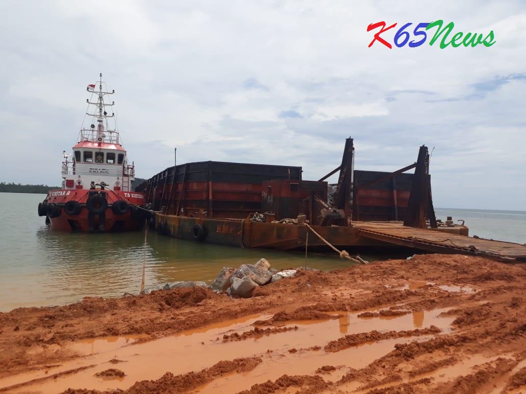Gambar : Ponton milik PT KBSM yang berisikan material batu sudah dua hari ditahan anggota TKBM Bumi Alam Jaya di Pelabuhan Kawasan Padang Dua Belas, Desa Pagar Mentimun.***(Dok.K65News).