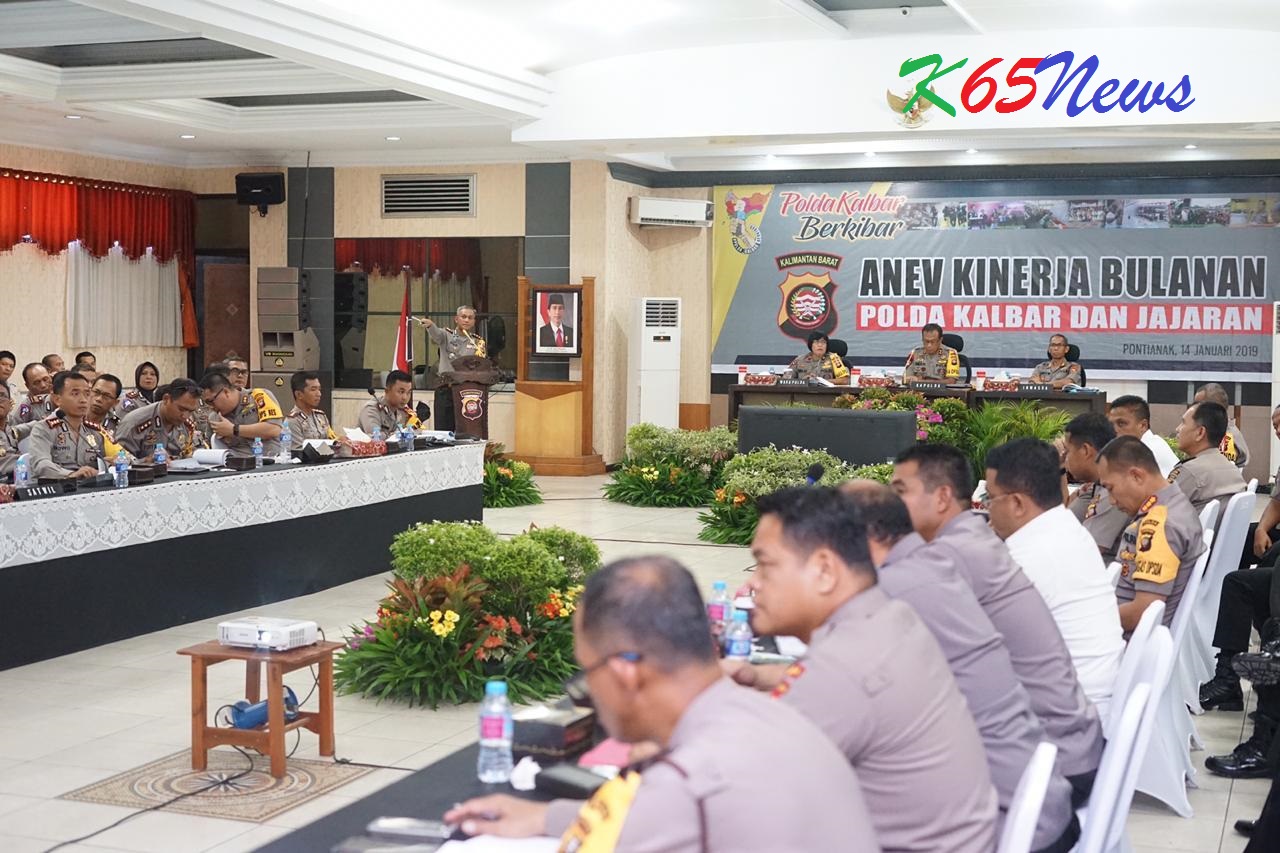 PONTIANAK – Polda Kalimantan Barat kembali menggelar rapat Analisa dan Evaluasi (Anev) Bulanan di Graha Khatulistiwa Polda Kalbar. Selain Pejabat Polda dan Kapolres jajaran, kali ini Anev Kinerja juga diikuti oleh pejabat Polres jajaran melalui Video Converence, Senin, (14/01/2019).