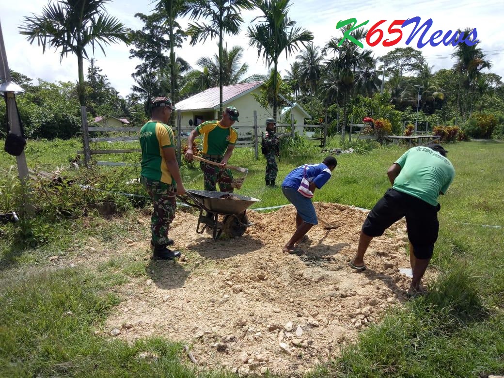 PAPUA – Prajurit Satgas Pamtas Yonif PR 328/DGH Pos Muara Tami yang dipimpin Sertu I Putu melaksanakan kegiatan karya bhakti pembuatan akses jalan menuju Gereja GKI Elsadae bersama masyarakat Desa Skouw Sae, Muara Tami, Jayapura, Senin (21/01/2019).