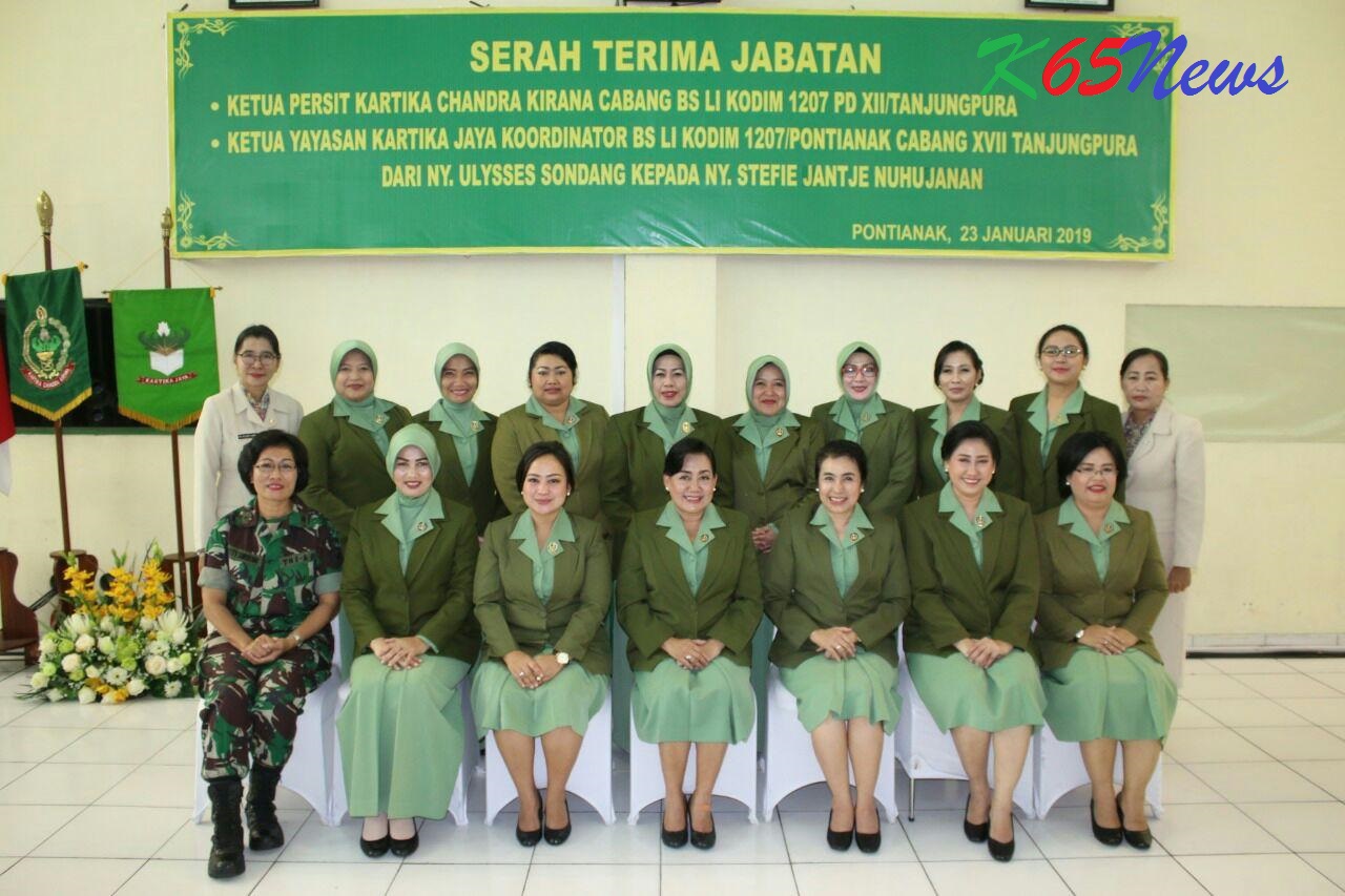 KUBU RAYA – Serah terima jabatan Ketua Persit Kartika Chandra Kirana Cabang BS LI Kodim 1207 dan Pengangkatan Ketua Persit Kartika Chandra Kirana Cabang IX Denmadam Pengurus Daerah XII/Tanjungpura yang dipimpin oleh Ketua Umum Persit Kartika Chandra Kirana Daerah XII/Tanjungpura Ny. Tien Achmad Supriyadi, dihadiri Pengurus Persit Kartika Chandra Kirana Daerah XII/Tanjungpura, Ketua Persit Kartika Chandra Kirana Koorcab Rem, Cabang, Ranting BS dan Ranting sejajaran Pengurus Daerah XII/Tanjungpura, di Aula Makodam XII/Tanjungpura, jalan Arteri Alianyang, Sungai Raya, Kubu Raya, Rabu (23/1/2019).
