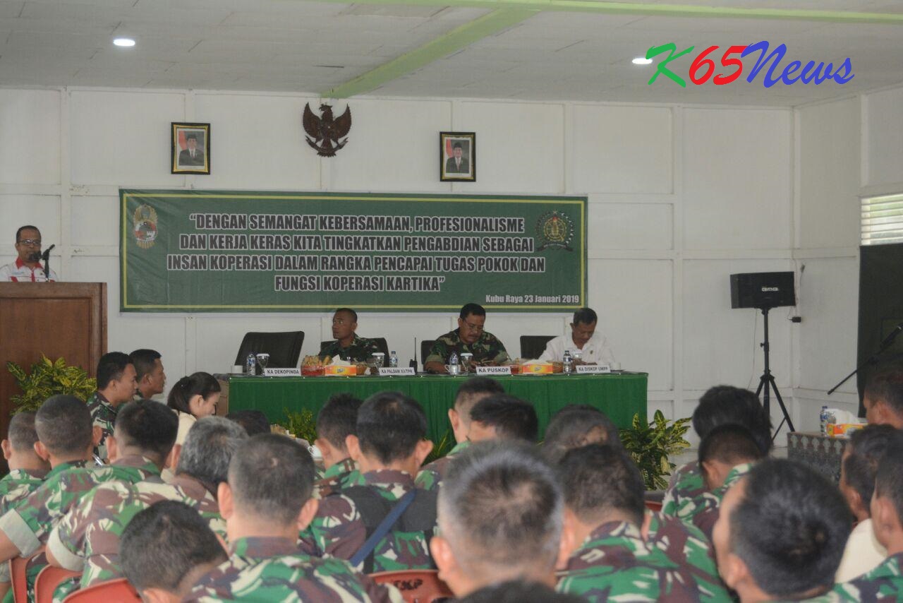 KUBU RAYA – Kepala Peralatan Kodam XII/Tanjungpura, Letnan Kolonel Cpl Octovianus Oscar Engelberth, S.I.P membuka Rapat Anggota Tahunan (RAT) Ke-8 Primer Koperasi Jasa Kartika Dwi Cakti Bhakti dan Tutup Buku Tahun 2018 di Aula Paldam XII/Tpr, Jalan Adi Sucipto, Sungai Raya, Kubu Raya, Rabu (23/1/19).