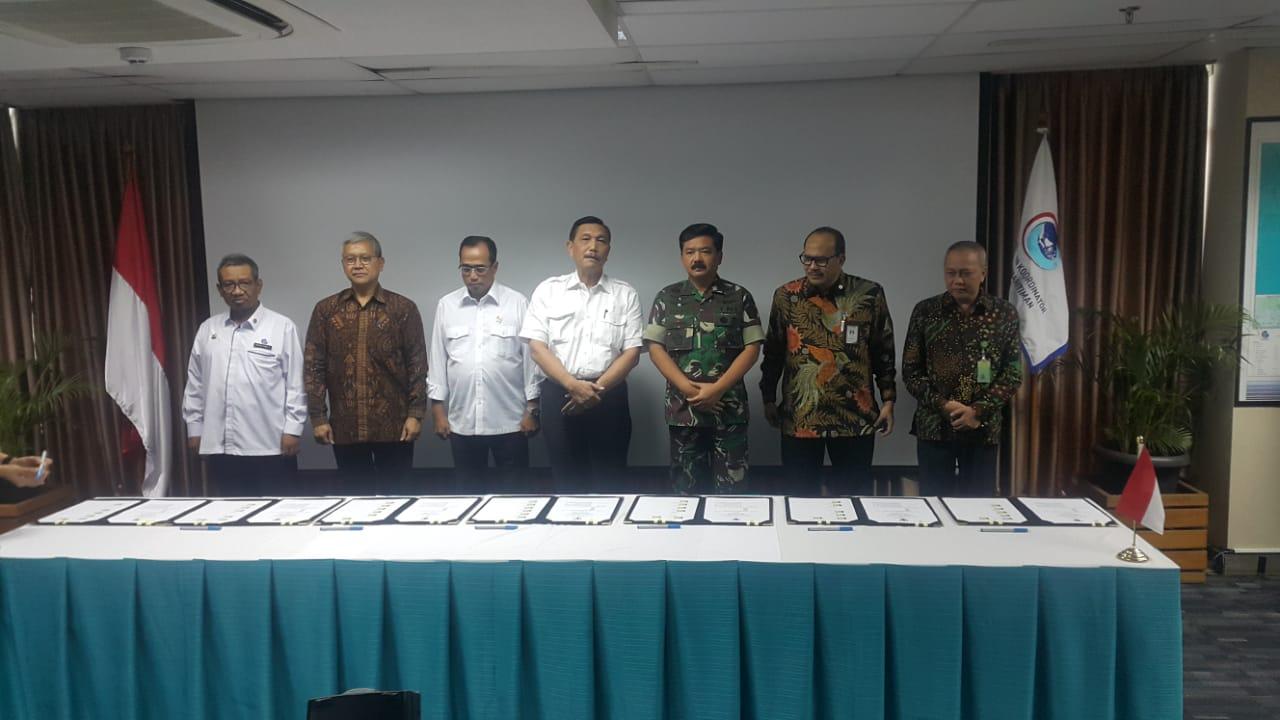 Penandatanganan Nota Kesepahaman Bersama, dilakukan oleh Panglima TNI, Marsekal TNI Hadi Tjahjanto, S.I.P., bersama Menteri Koordinator Bidang Kemaritiman Republik Indonesia, Jenderal TNI (Purn) Luhut Binsar Pandjaitan dan Menteri Perhubungan Republik Indonesia, Budi Karya Sumadi, bertempat di Ruang Rapat Lantai 2 Selatan, Gedung Kemenko Kemaritiman, Jl. M.H. Thamrin No. 8 Jakarta Pusat, Selasa (26/3/2019).