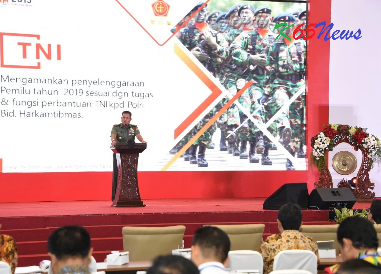 Hal tersebut dikatakan Kepala Staf Umum (Kasum) TNI, Letjen TNI Joni Supriyanto mewakili Panglima TNI, Marsekal TNI Hadi Tjahjanto, S.I.P. saat menjadi narasumber pada Rapat Koordinasi Nasional (Rakornas) Bidang Kewaspadaan Nasional dalam rangka Pemantapan Penyelenggaraan Pemilu 2019 di Grand Paragon Hotel, Jakarta Pusat, Rabu (27/3/2019).
