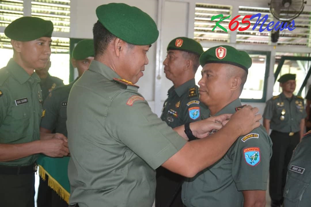 SINGKAWANG – Komandan Resimen Induk Daerah Militer XII/Tanjungpura, Kolonel Inf Martin Susilo M. Turnip, S.H berikan penghargaan kepada Perwira yang sudah memasuki pensiun serta melantik kenaikan pangkat Perwira, Bintara dan Tamtama di Aula Sudirman Rindam XII/Tpr pada Kamis (04/04/2019) kemarin.