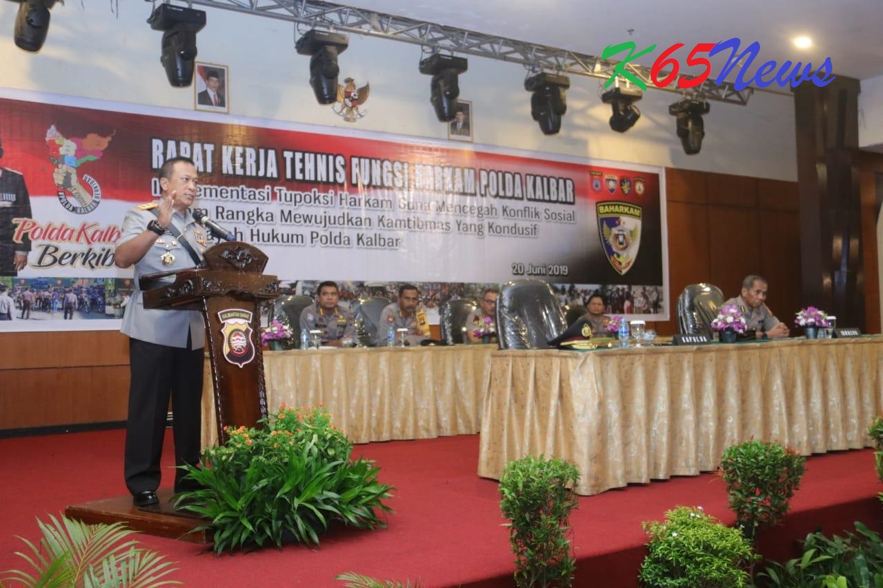 PONTIANAK – Polda Kalbar menggelar Rakernis Fungsi Harkam Tahun 2019 di Aula Hotel Aston Pontianak, Kamis (20/6/2019). Acara dibuka langsung oleh Kepala Kepolisian Daerah Kalimantan Barat Inspketur Jenderal Polisi Drs Didi Haryono SH MH pada pukul 09.00 WIB.
