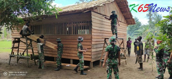 MERAUKE – Kepedulian Satuan Tugas Pengamanan Perbatasan (Satgas Pamtas) Batalyon Infanteri 125/Simbisa (Yonif 125/SMB) terhadap pendidikan anak-anak di perbatasan RI-PNG, Prajurit Satgas gotong royong dengan warga mendirikan bangunan ruang belajar Pendidikan Anak Usia Dini (PAUD).