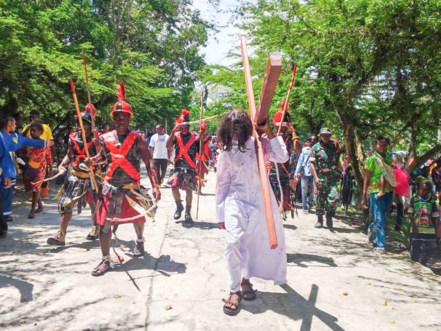 TIMIKA – Babinsa Koramil 1710-07/Mapurujaya, Sertu Yulius Nampe, melaksanakan pengamanan kegiatan ibadah dan prosesi jalan salib yang berlangsung di Distrik Mimika Timur, Jumat (3/4/2026). Kegiatan jalan salib tersebut diikuti oleh masyarakat setempat sebagai bagian dari rangkaian peringatan keagamaan. Prosesi dilaksanakan dengan berjalan kaki menyusuri rute dari Kampung Muare menuju Kampung Kaugapu sambil membawa simbol-simbol keagamaan.