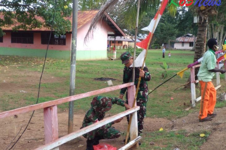 Hankam Lintas Daerah Serba Serbi Jelang Peringatan HUT RI Ke-75, Prajurit Pamtas Yonif 125 Kerja Bakti Bersama Guru dan Siswa Agustus 11, 2020